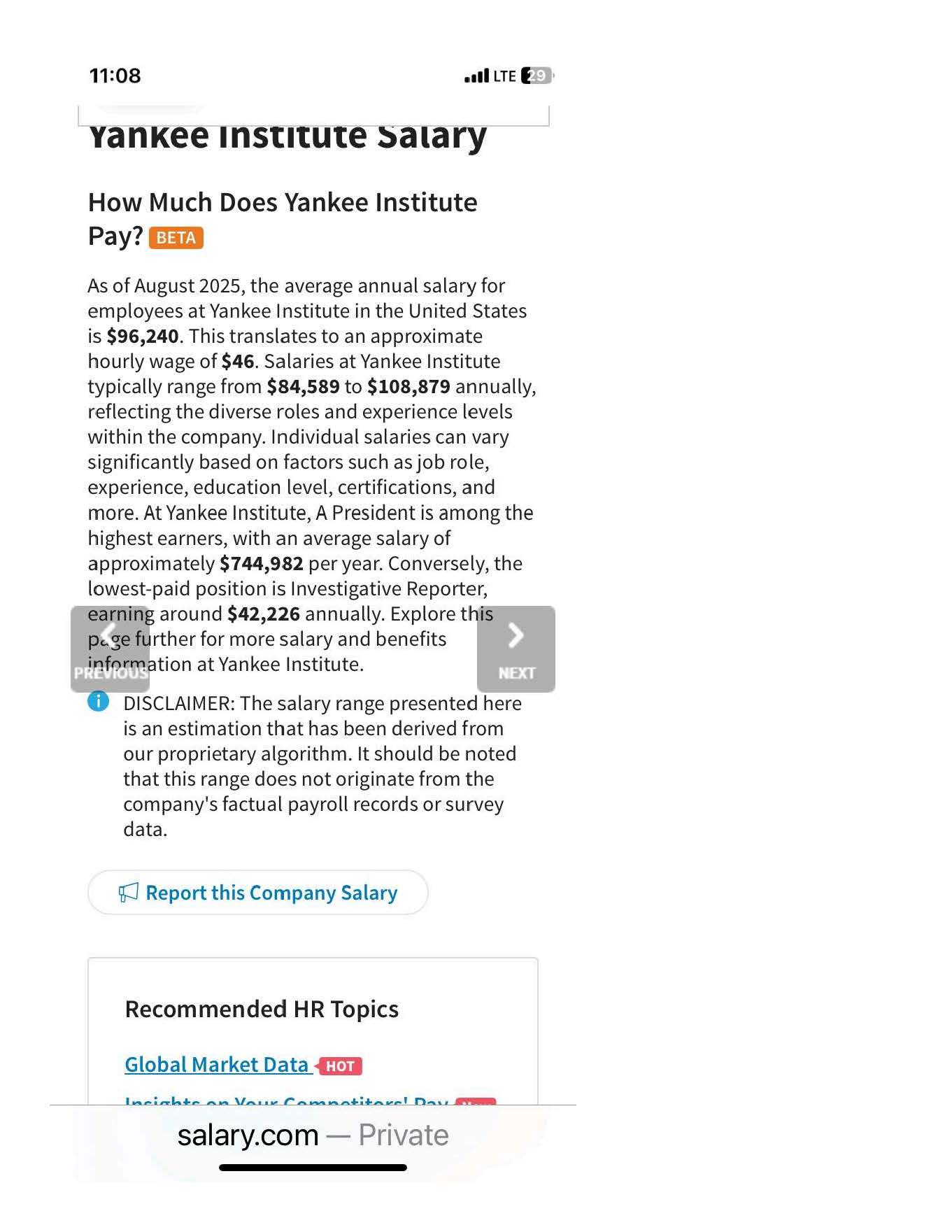 Mistakenly, he assumed that I work for Yankee Institute. He sent me information from Salary.com, which estimated that “Yankee salaries typically range from $84,589 to 108,879” (not “almost 200k”). Based upon its “proprietary algorithm,” Salary.com estimated that Yankee’s president makes $744,982. As a non-profit, Yankee is required to file a Form 990 with the IRS, including compensation information, which showed Yankee’s president making $217,000.