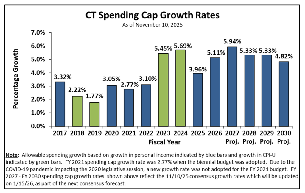 Maybe he meant the current fiscal year, FY 2026, ending next June? If so, he has got a problem. According to budget rules, spending can’t exceed growth in the state’s economy (or the rate of inflation, if higher). Ned’s problem is two-fold: too much spending and too little economic growth. He and his fellow party members in the General Assembly budgeted too much spending and there was “no room under the spending cap to pay raises to most state workers [in fiscal 2026],” as the CT Mirror reported late last spring. Once set, the spending cap is fixed for the year.