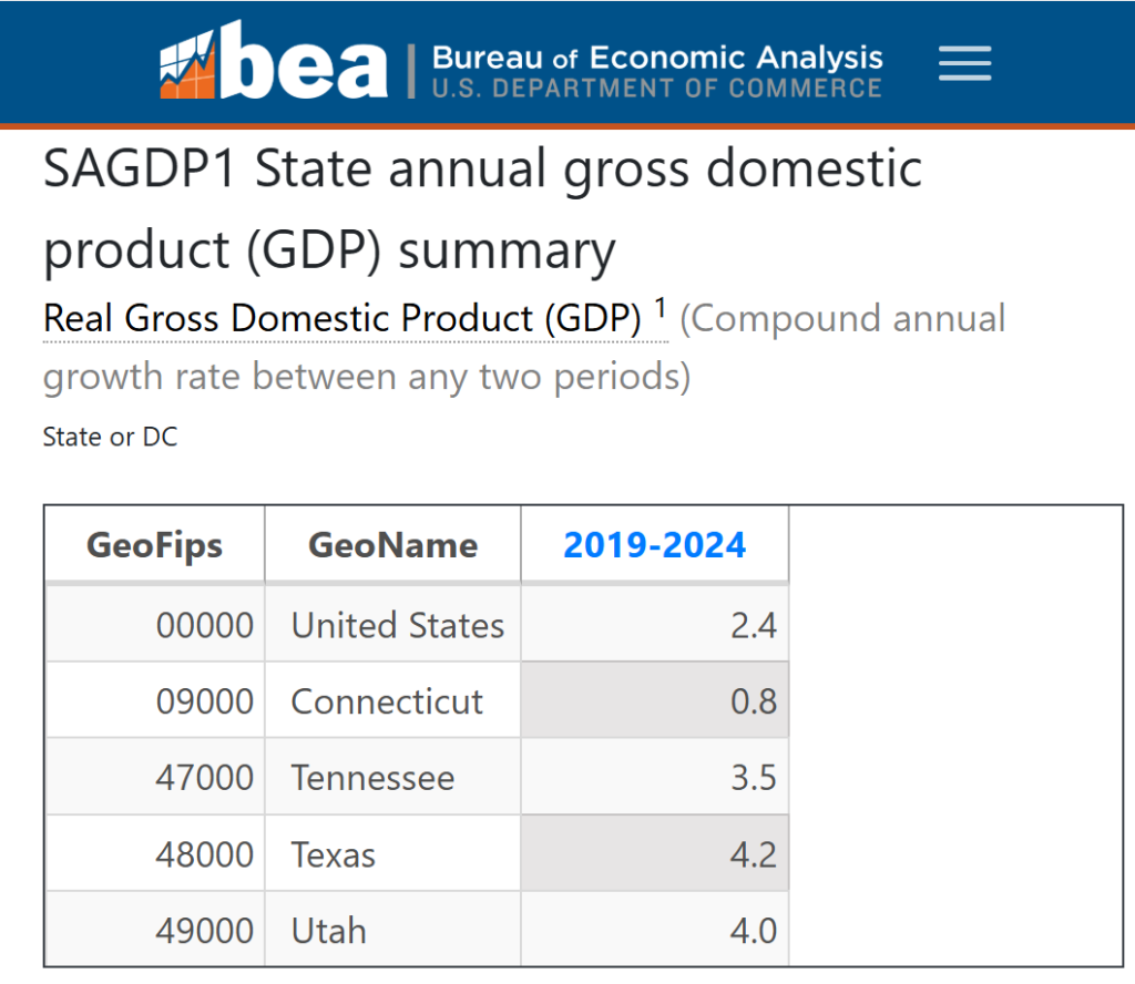 The dichotomy is stark. Despite Lamont’s crowing about a “Connecticut Comeback,” the state’s real GDP grew at an anemic annual compound rate of 0.8 percent from 2019 to 2024, according to the Bureau of Economic Analysis, and only 0.2 percent annualized from $288 billion in the fourth quarter of 2024 to $291 billion in the second quarter of 2025.